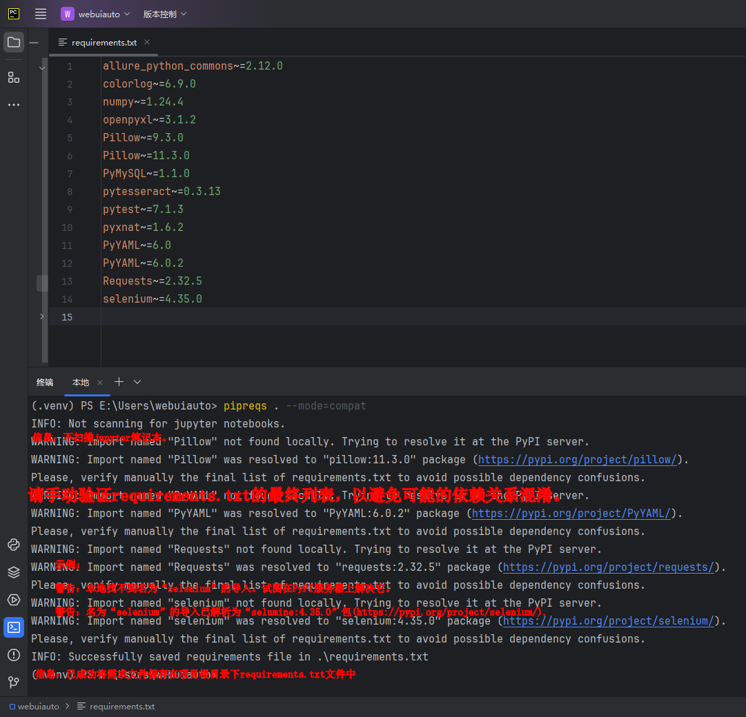虚拟环境依赖:只能分析当前项目代码中的导入语句,对于虚拟环境中安装但项目代码未使用的库,不会包含在生成的requirements.txt文件中;