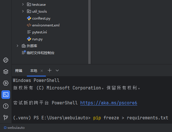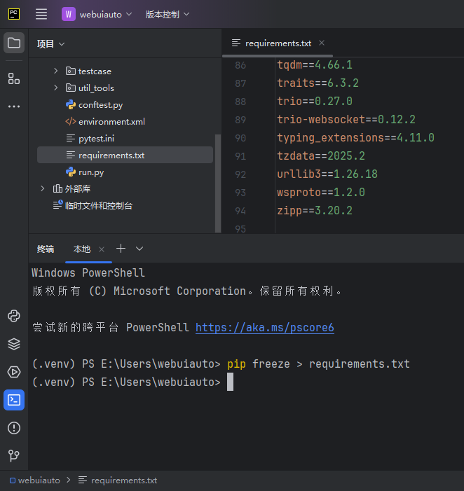 pip freeze 命令可以列出当前环境中安装的所有包及其版本;若已经在虚拟环境或全局环境中安装了所有需要的依赖包,可以直接使用此命令来生成 requirements.txt 文件,这是最基本最常用的方法,比较简单,不需要额外的其他工具,不过不推荐使用;适用于快速原型开发型项目;
