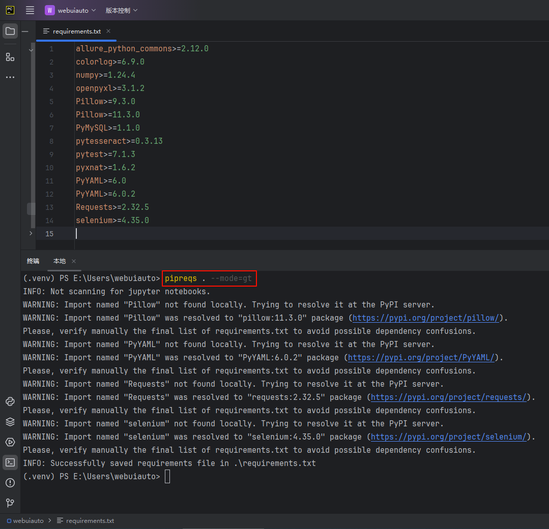 pipreqs ./ --encoding=utf8 --force --mode=gt --savepath=E:\Users\webuiauto\requirements.txt