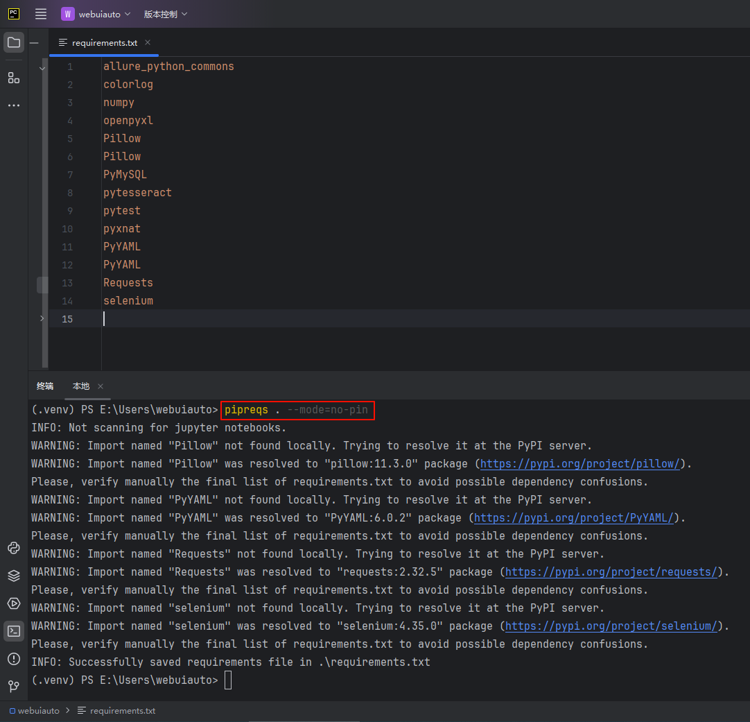 pipreqs . --savepath=E:\Users\webuiauto\requirements.txt