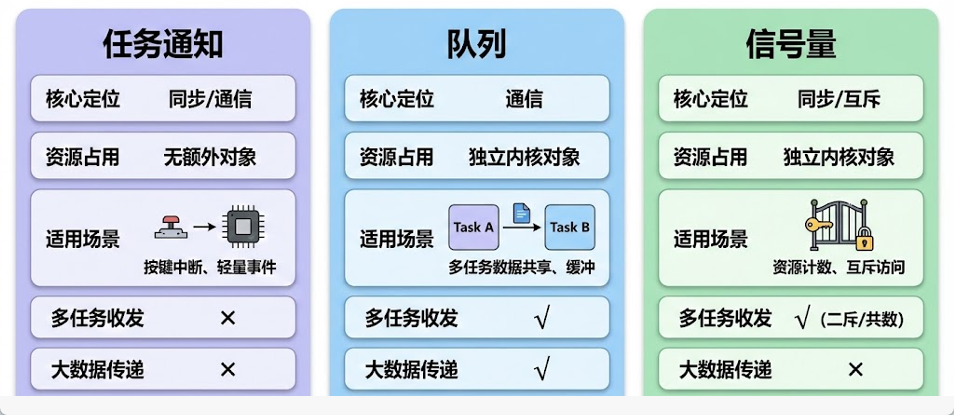 - 延伸:资源受限场景优先用任务通知,复杂多任务通信用队列。