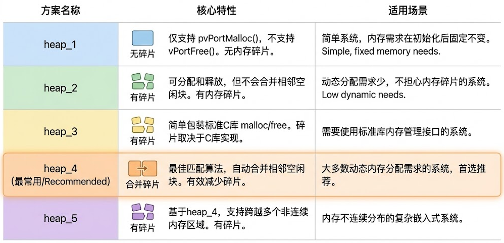 | 内存管理方案(heap_1~heap_5) | FreeRTOS提供5种内存分配方案,基于静态/动态内存实现,适配不同嵌入式场景的内存约束 | heap_1:仅分配不释放,无碎片;heap_2:可分配释放,不合并碎片;heap_3:封装标准malloc/free;heap_4:可分配释放+合并碎片(最常用);heap_5:heap_4基础上支持非连续内存块 | heap_1(只读存储器/无释放场景);heap_4(绝大多数通用场景);heap_5(多块离散内存) |