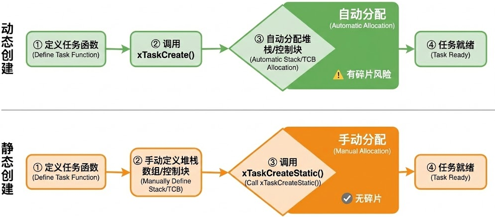 - 静态创建:手动分配内存,无碎片,适合高可靠/内存受限场景。