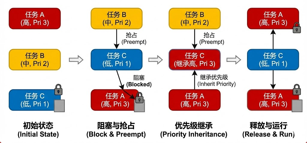- 案例:①创建高优先级任务A、中优先级任务B、低优先级任务C;②C持有互斥锁,A请求该锁进入阻塞;③B抢占C执行,导致A迟迟无法运行(优先级反转);④启用互斥锁优先级继承后,C的优先级临时提升到A的级别,B无法抢占,C执行完释放锁,A立即执行,解决反转。