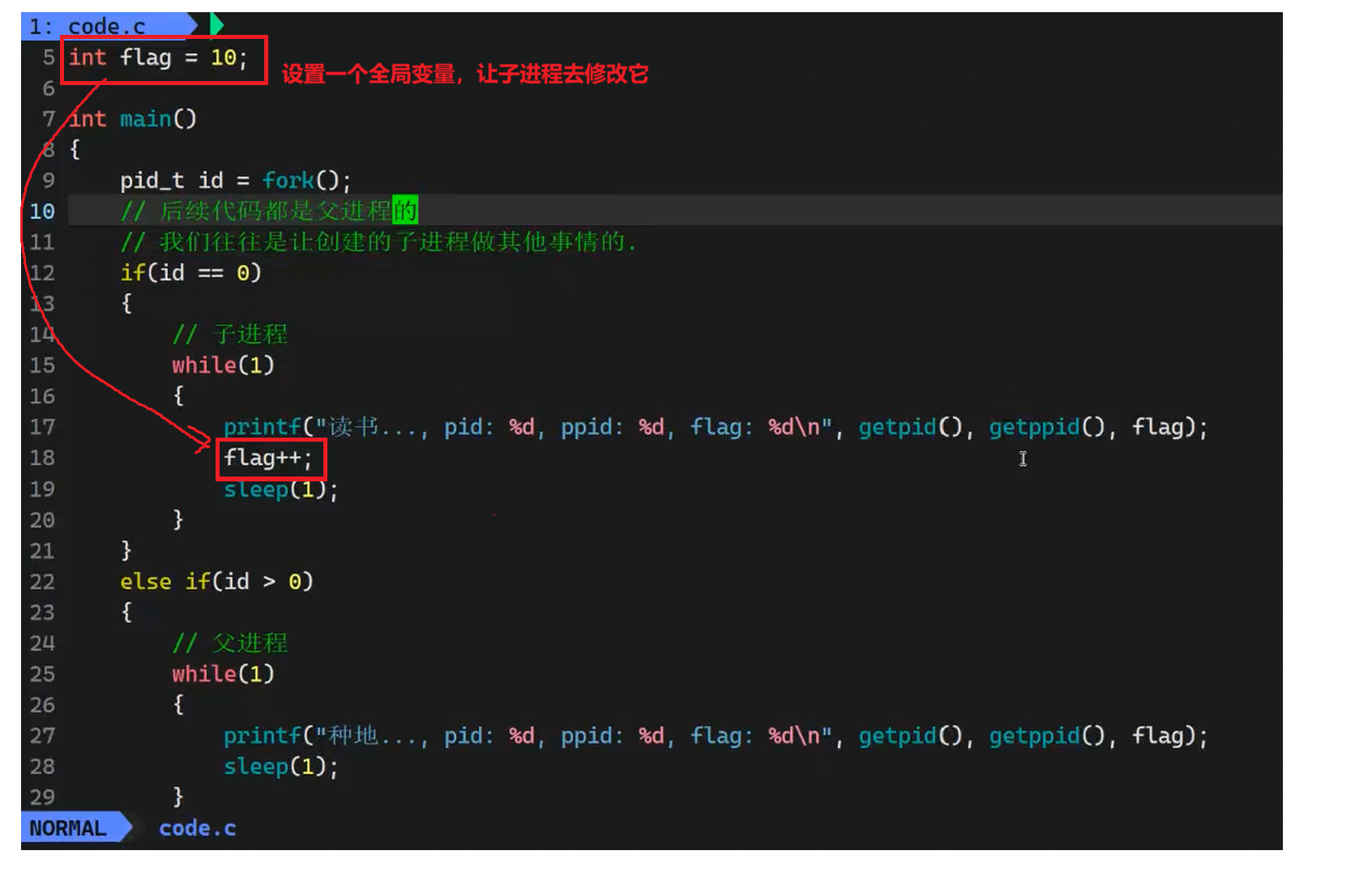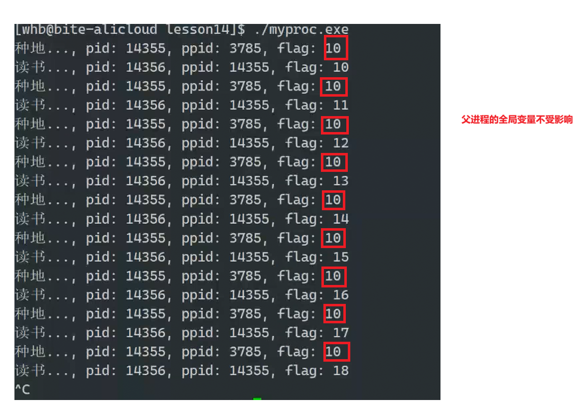 但是我们运行了之后发现:父进程的flag居然不受影响!!