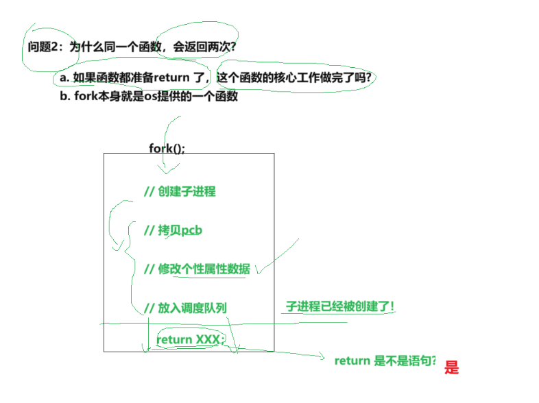 调用函数时,是需要进入函数内部。fork准备return时,子进程已经创建好了,此时fork内部有夫,子两个进程,也已经被操作系统管理起来了。