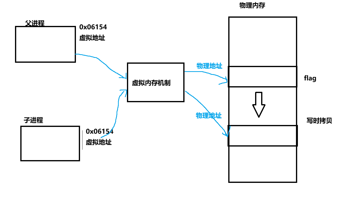 子进程继承父进程的虚拟内存空间,如果不修改数据,打印出来的地址一样。但是如果数据修改,系统会在物理内存中拷贝一个flag,这个拷贝就叫做写时拷贝。此时子进程会通过虚拟内存机制,映射到这个新的flag