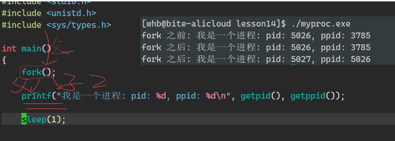 return是语句,此时父进程和子进程都需要return(return的代码被共享),各自return一次,返回两次