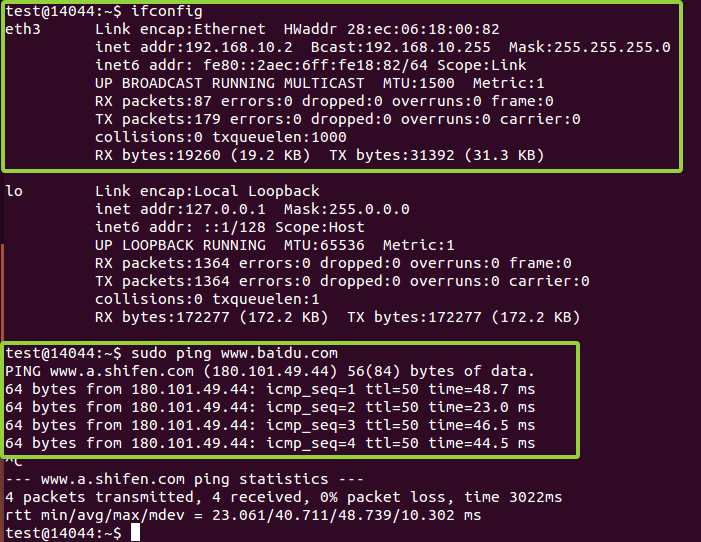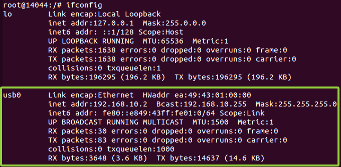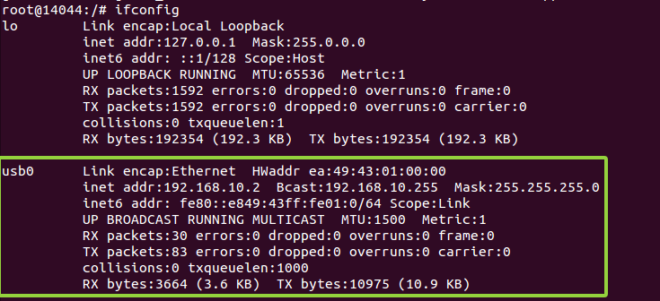 查询网卡信息可以看到,模块默认的网口名称为ethX,地址为192.168.10.2的内网IP。