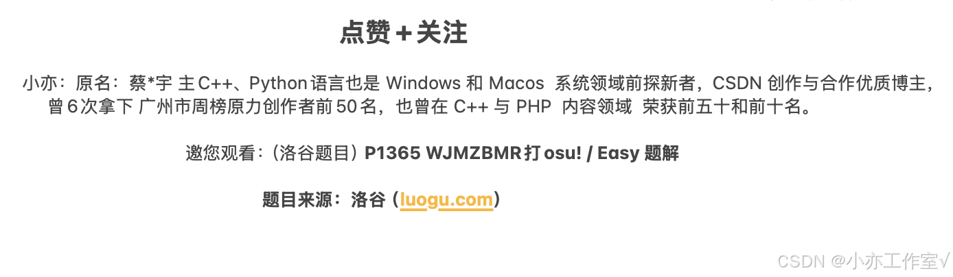 Hello 大家好,这里是小亦,是不是想念小亦博主了呀,因为一些事情导致小亦一直没时间为大家更新文章了,现在呢也是回归了呢~那话不多说那我们今天所观看就是来自洛谷的一篇题解话不多说~