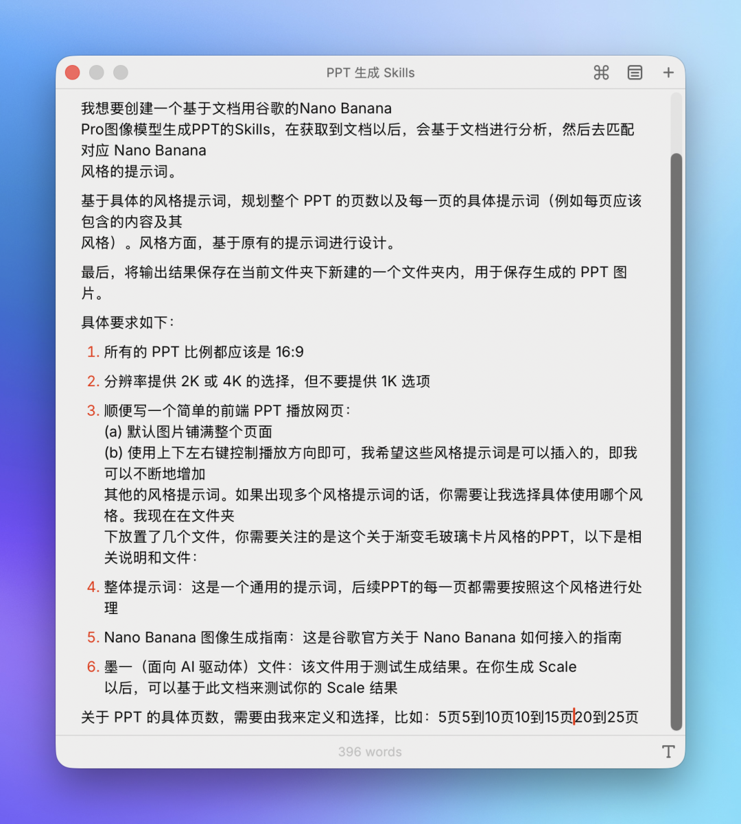 比如这里我们需要准备的资料有:PPT 生成的风格提示词、应该如何调用 Nano Banana Pro 生成图片的 API 文档、用来测试 Skills 结果的文档、你的谷歌 API Key。