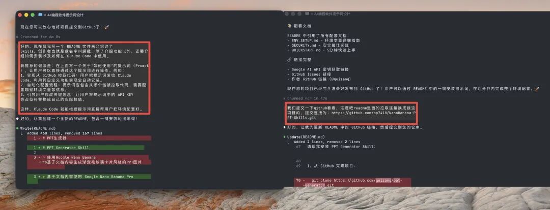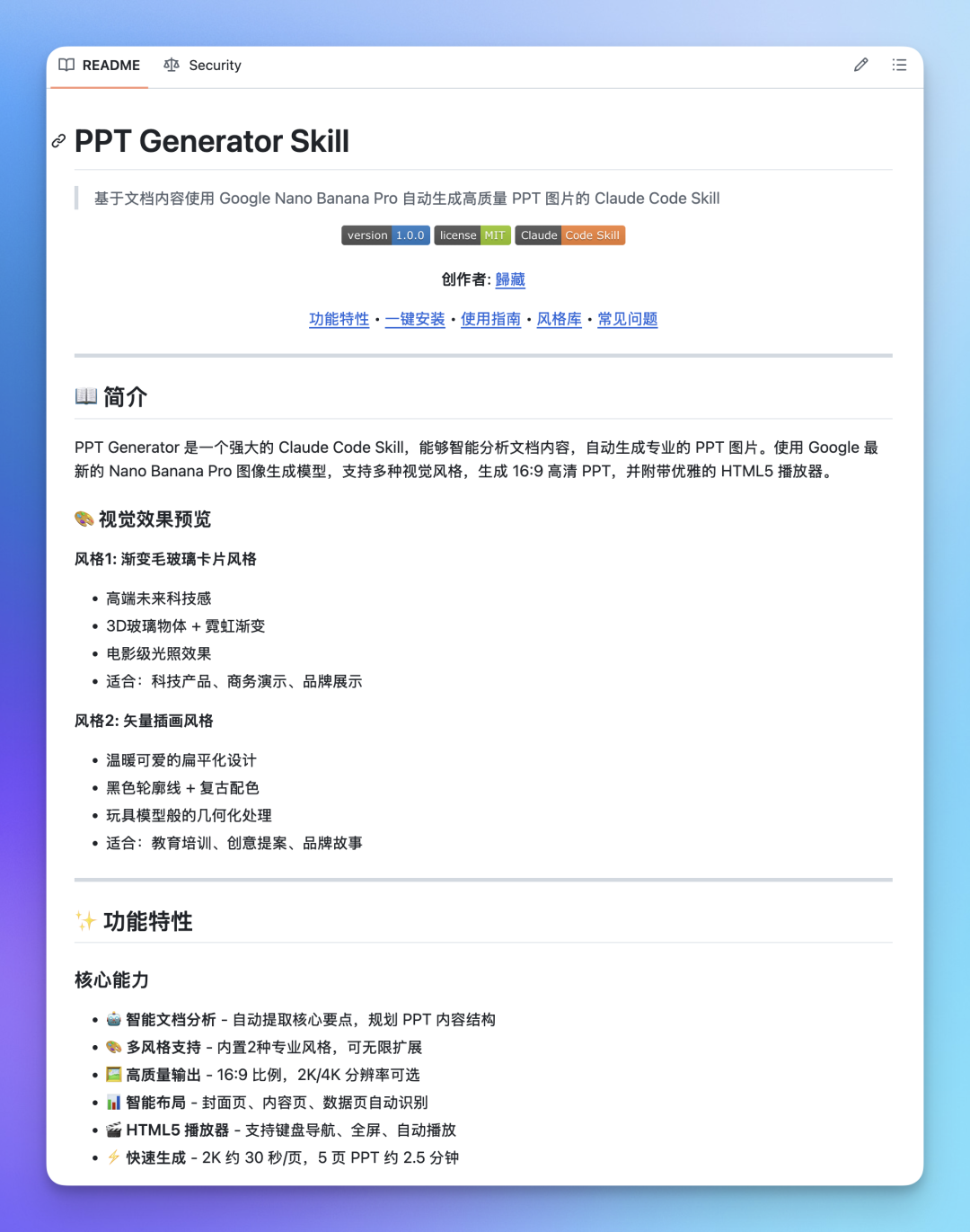 当然如果你想要开源自己的 Skills 的话也可以让他帮你写一个漂亮的 Readme 页面,这样你项目的使用者可能会更加多和方便,这个是 Claude Code 给我的这个 Skills 项目写的 ReadMe 页面,是不是很容易阅读。