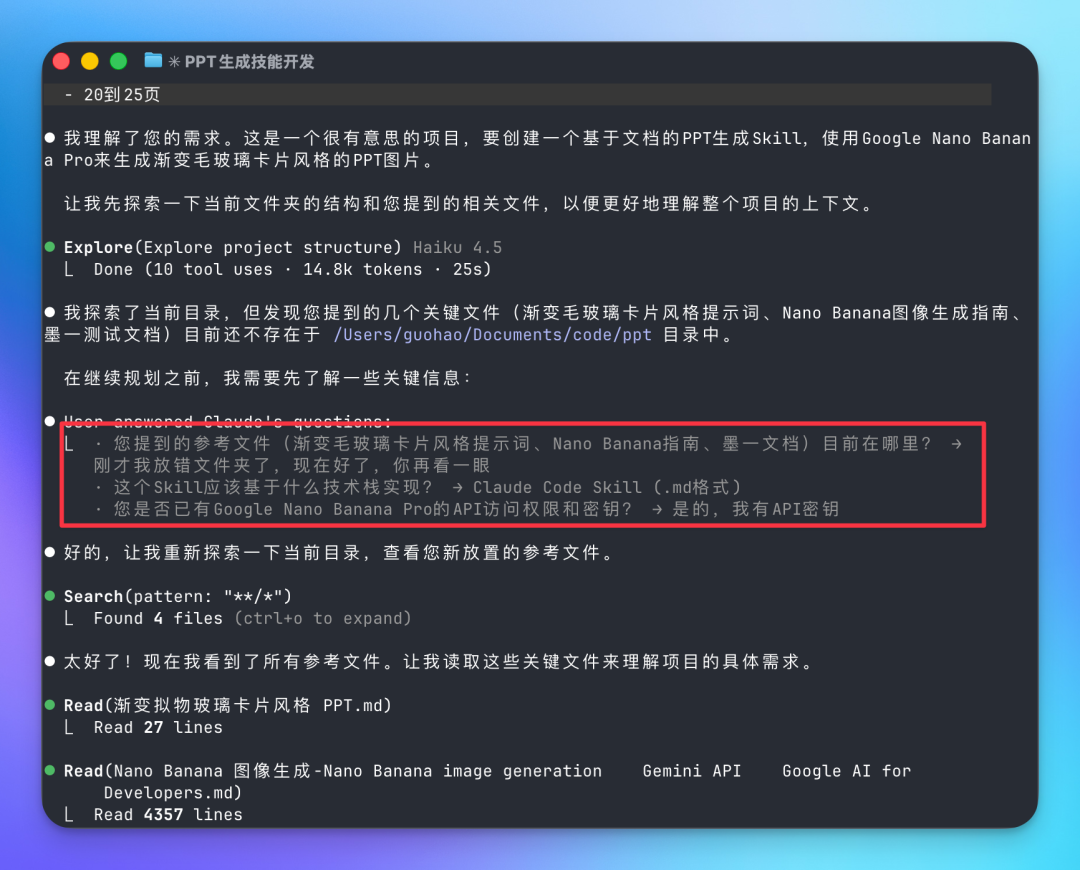 提前把这些上下文背景信息准备好之后就避免了在生成过程中 Claude 自己瞎写的可能性,比如在调用 Nano Banana Pro 生成图片的时候由于他不是完全清楚这些参数,就有可能自己瞎写,很容易出问题。