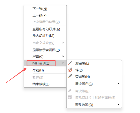 放映中右键鼠标:选择【指针选项】→【激光笔】或【画笔】,这在讲重点内容时特别好用。