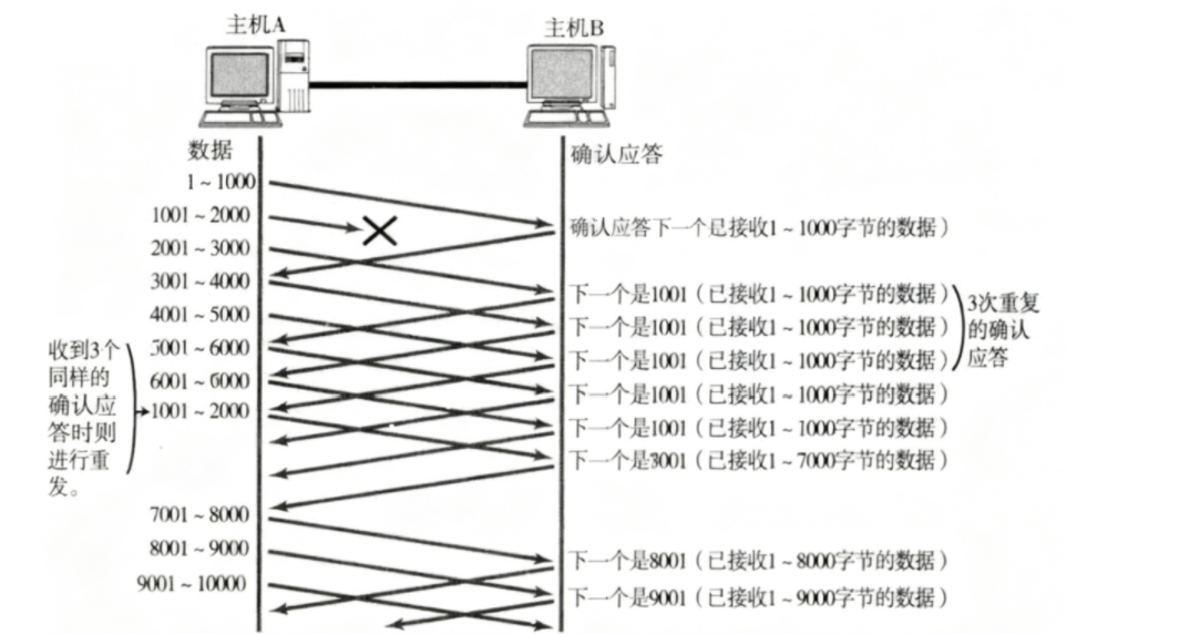 如下如果一个报文丢失了,那么他会应答都是历史已经收到的报文,收到三个同样的确认应答时会启动快重传,快重传提高速率上限,超时重传用来兜底