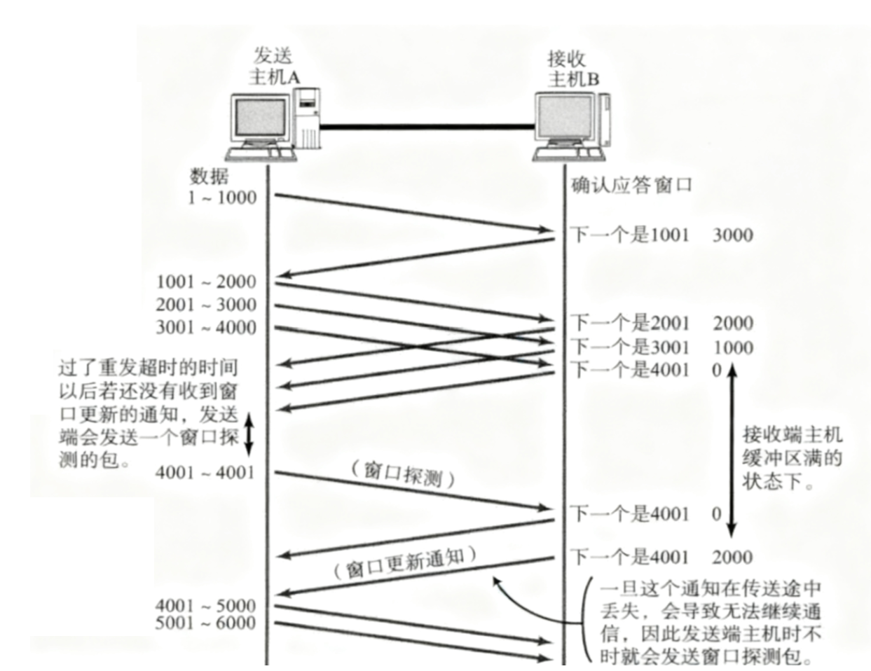 - 要是接收端的缓冲区已经满了,就会将窗口值设为 0;此时发送端不再发送数据,但需要定期发送一个窗口探测数据段,让接收端把当前的窗口大小告知自己。