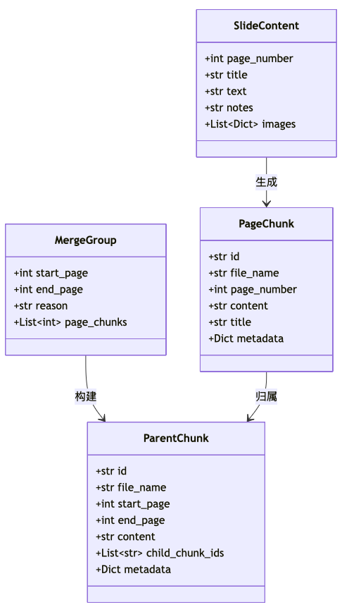 PageChunk是向量检索的最小单元,一页对应一个ParentChunk包含多个PageChunk的内容,用于给LLM提供完整上下文child_chunk_ids建立父子关联,检索时通过子块找到父块