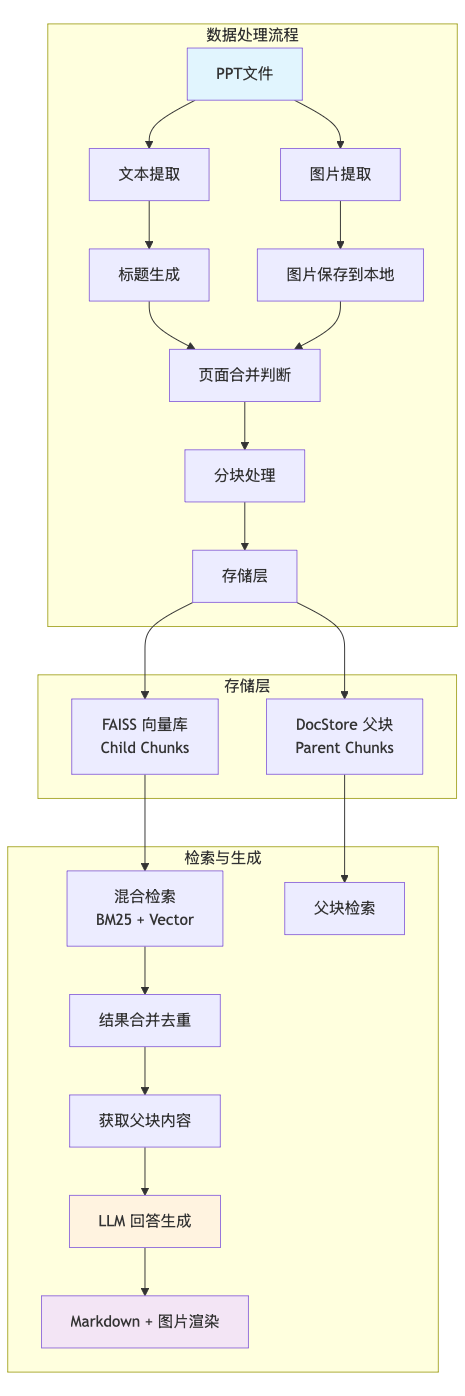 本文将深度拆解一套专门针对PPTx格式设计的RAG智能问答系统。我们将不再只是堆砌代码,而是从父子分块架构、跨页逻辑聚合、多模态图文对齐等核心技术维度,分析如何让大模型真正"看懂"幻灯片背后的深意。