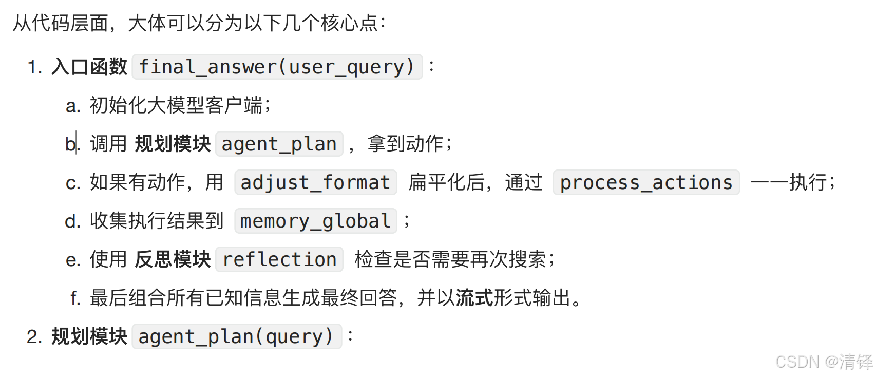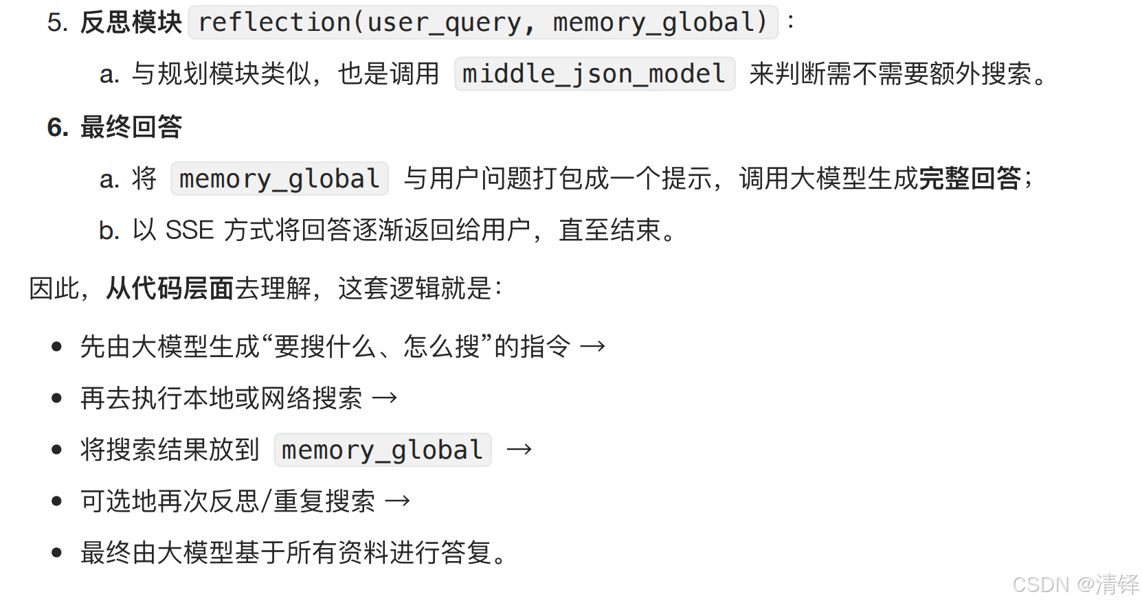 通过调用检索知识库和联网搜索的知识库生成prompts,再调用大模型进行回答,还有一个规划模块预判用户query的动机和未来决策,最终大模型流式输出给前端。做的这些都是为了agent可以给出有来源且高质量的回复