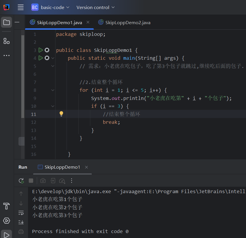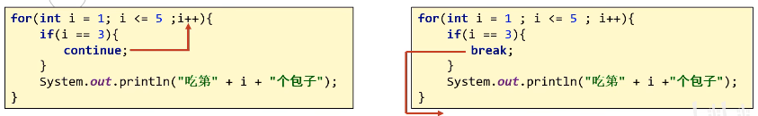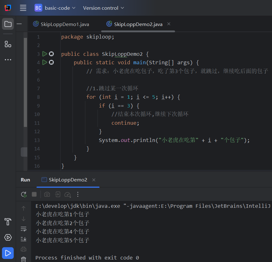 **需求:**小老虎吃包子,吃到第3个包子就跳过,继续吃后面的包子.