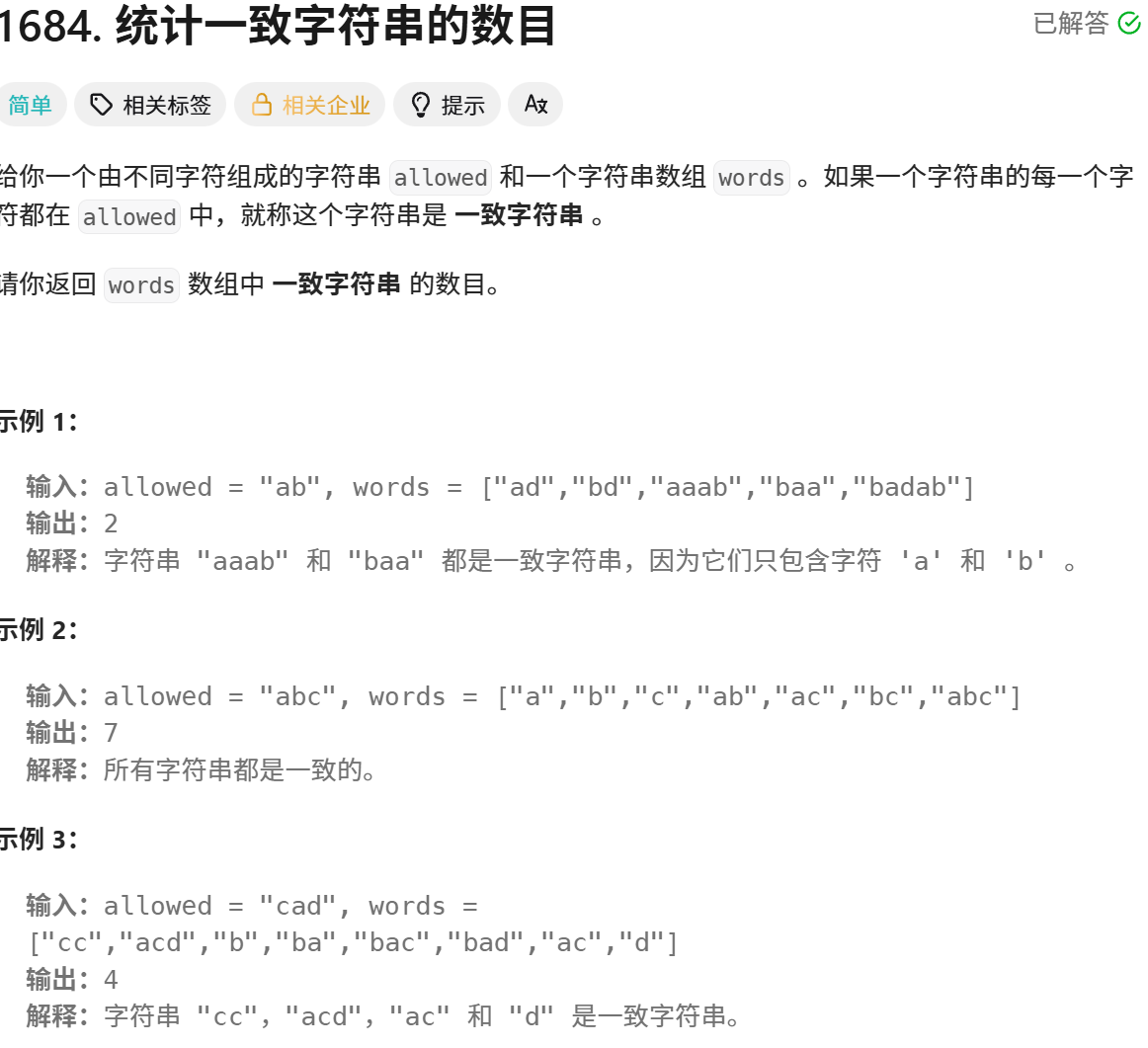 我们先将allowd数组中的元素都标记为1,表示出现过,然后遍历words数组的每个元素,然后再遍历一遍words数组中每个元素的每个字符,如果发现这个字符在哈希表中没有标记成1,代表没有出现过,这时候我们break跳出循环。