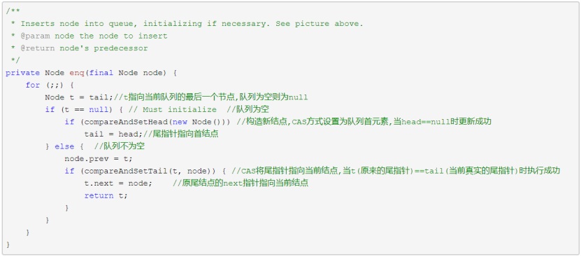 外层的for循环保证了所有获取锁失败的线程经过失败重试后最后都能加入同步队列。队列为空时要进行特殊处理,这部分在if分句中。注意当前线程所在的结点不能直接插入空队列,因为阻塞的线程是由前驱结点进行唤醒的。故先要插入一个结点作为队列首元素,当锁释放时由它来唤醒后面被阻塞的线程,从逻辑上这个队列首元素也可以表示当前正获取锁的线程,虽然并不一定真实持有其线程实例。