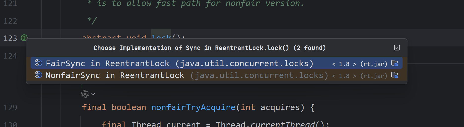 底层调用了nonfairTryAcquire()从方法名上我们就可以知道这是非公平模式下尝试获取锁的方法,具体方法实现如下