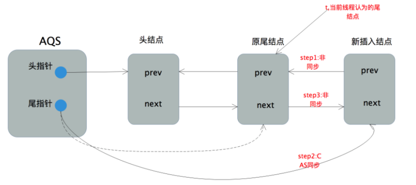 首先当前线程所在的结点的前向指针pre指向当前线程认为的尾结点,源码中用t表示。然后以CAS的方式将尾指针指向当前结点,该操作仅当tail=t,即尾指针在进行CAS前未改变时成功。若CAS执行成功,则将原尾结点的后向指针next指向新的尾结点。整个过程如下图所示