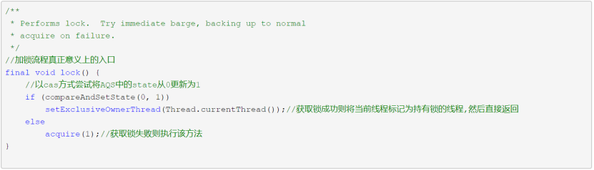 首先尝试快速获取锁,以cas的方式将state的值更新为1,只有当state的原值为0时更新才能成功,因为state在ReentrantLock的语境下等同于锁被线程重入的次数,这意味着只有当前锁未被任何线程持有时该动作才会返回成功。若获取锁成功,则将当前线程标记为持有锁的线程,然后整个加锁流程就结束了。