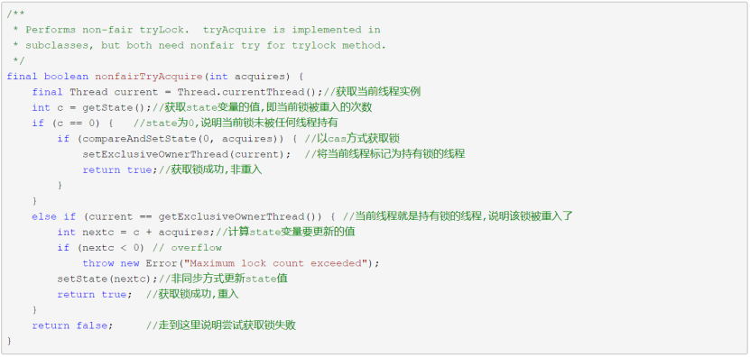- 2.若锁已经被当前线程获取(state>0,exclusiveOwnerThread为当前线程),则将锁的重入次数加1(state+1),然后返回成功结果。因为该线程之前已经获得了锁,所以这个累加操作不用同步。