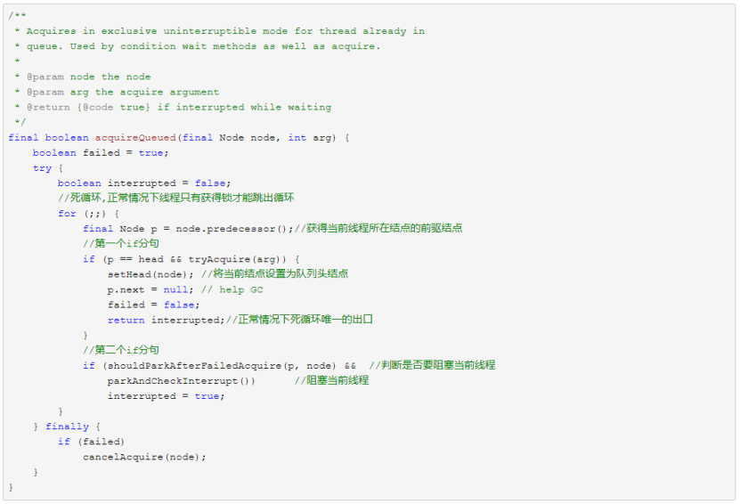 第一个if分句中,当前线程首先会判断前驱结点是否是头结点,如果是则尝试获取锁,获取锁成功则会设置当前结点为头结点(更新头指针)。为什么必须前驱结点为头结点才尝试去获取锁?因为头结点表示当前正占有锁的线程,正常情况下该线程释放锁后会通知后面结点中阻塞的线程,阻塞线程被唤醒后去获取锁,这是我们希望看到的。然而还有一种情况,就是前驱结点取消了等待,此时当前线程也会被唤醒,这时候就不应该去获取锁,而是往前回溯一直找到一个没有取消等待的结点,然后将自身连接在它后面。一旦我们成功获取了锁并成功将自身设置为头结点,就会跳出for循环。否则就会执行第二个if分句:确保前驱结点的状态为SIGNAL,然后阻塞当前线程。