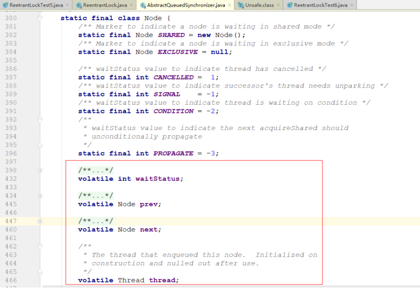 - thread:当前结点表示的线程,因为同步队列中的结点内部封装了之前竞争锁失败的线程,故而结点内部必然有一个对应线程实例的引用