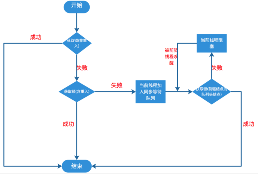 概括的说,线程在同步队列中会尝试获取锁,失败则被阻塞,被唤醒后会不停的重复这个过程,直到线程真正持有了锁,并将自身结点置于队列头部。