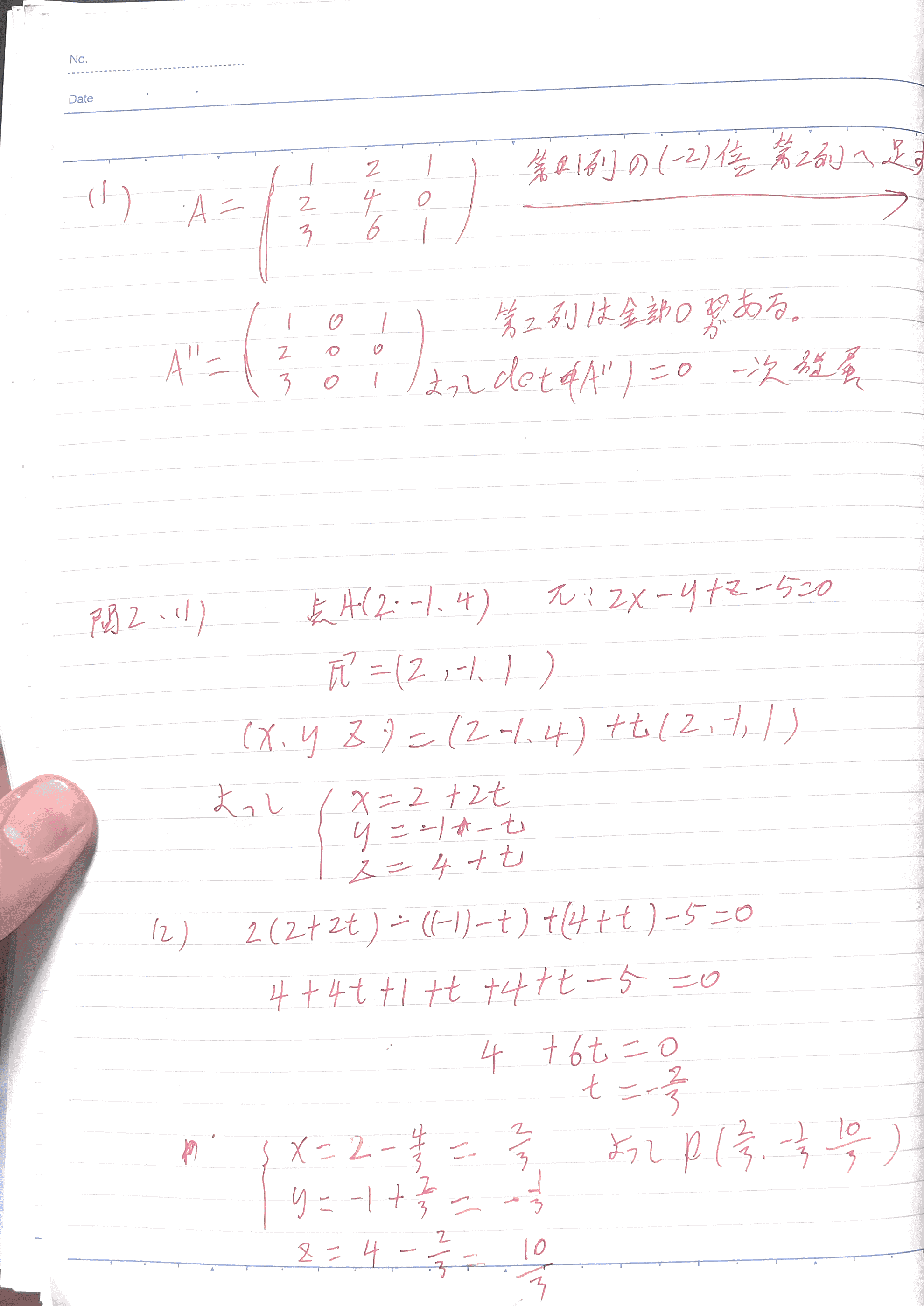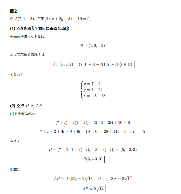 (1) 点 (A) を通り,平面 (\pi) に垂直な直線の方程式を求めよ。