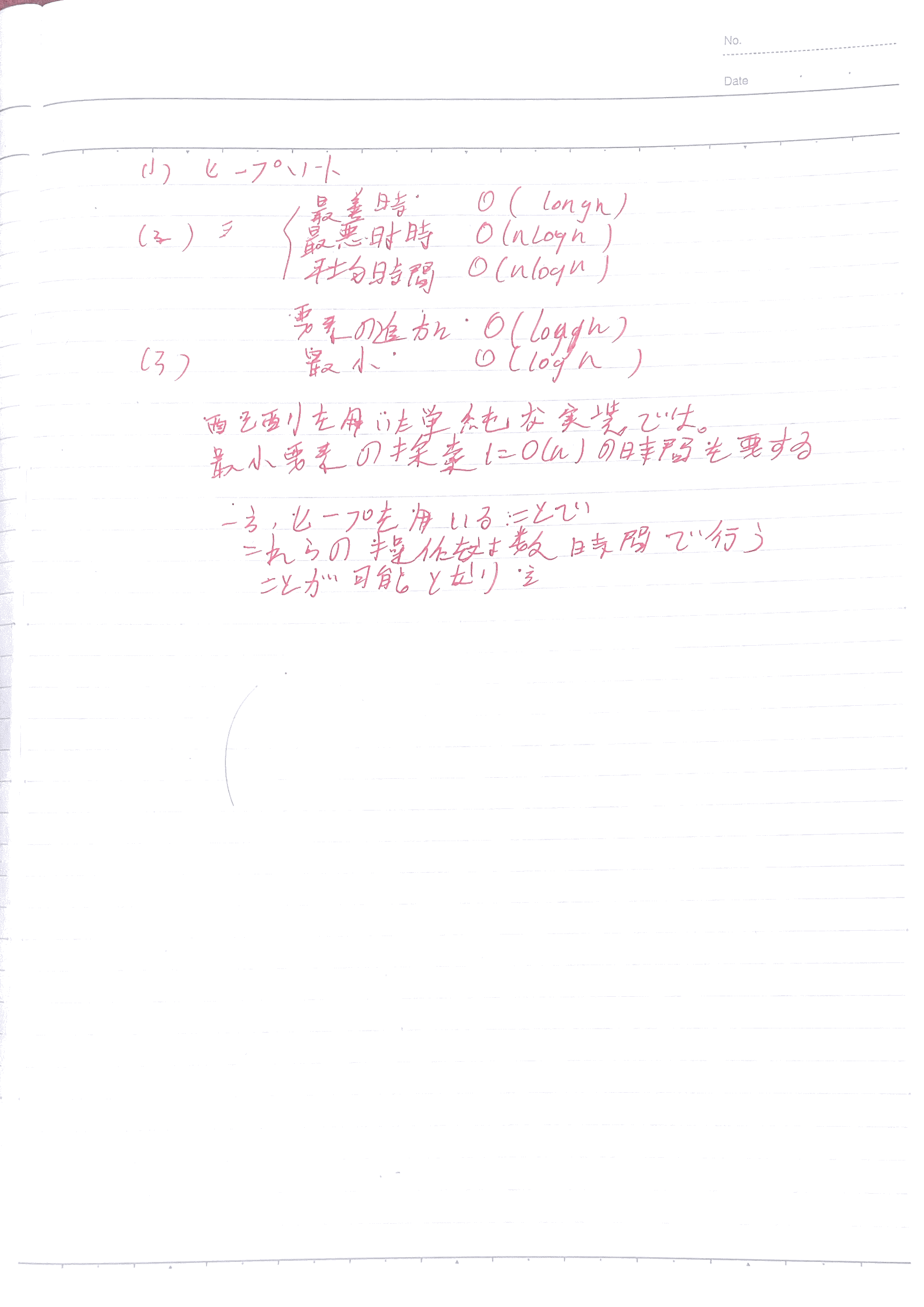 要素数 (n) の最大ヒープに対して,新たな要素を 1 つ挿入する操作の時間計算量を,