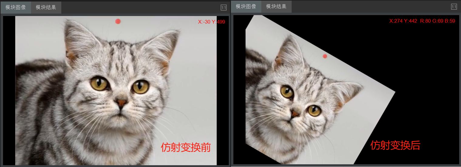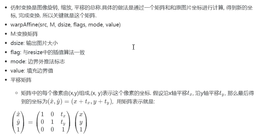 仿射变换包含了图像的平移、旋转、缩放,原理是通是设置的矩阵与原图像素坐标进行计算,得到新的图像。