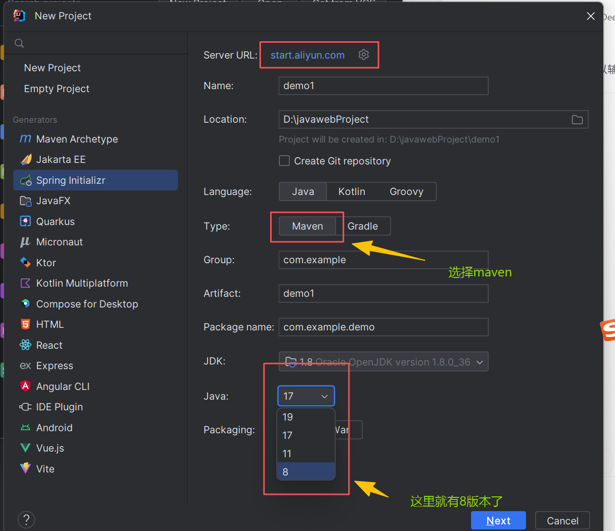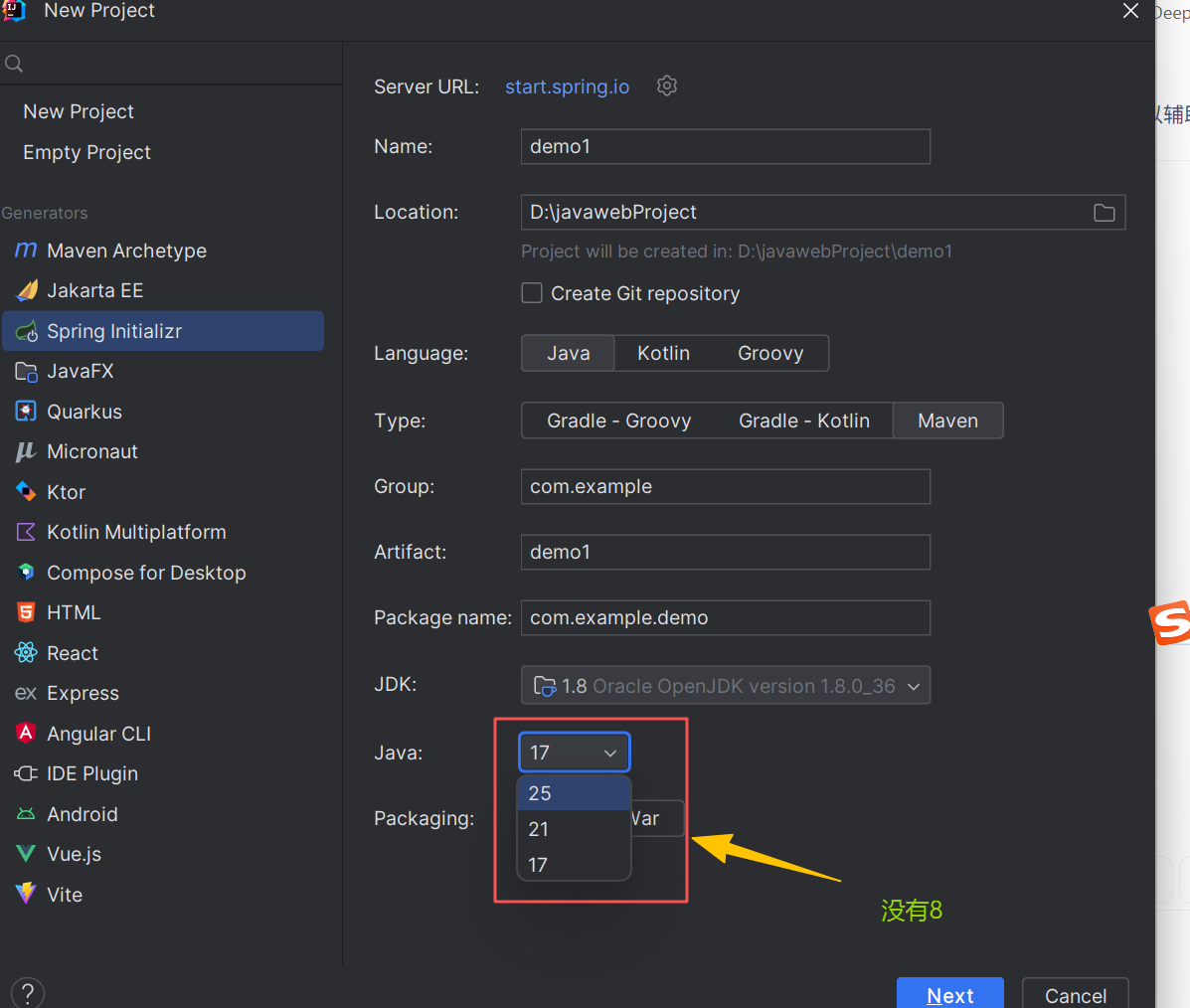 这是因为你使用的是spring Boot官网的联网工具来创建spring Boot项目,又由于此时官网的spring Boot版本是最新版本(4.0.2),超过3.0版本,所以对应的jdk必需是17版本以上,故没有8版本的,因此我们需要更换spring Boot官网的联网工具(https://start.spring.io),将它改为阿里云应用脚手架(https://start.aliyun.com/)来构建springboot项目,如下图所示