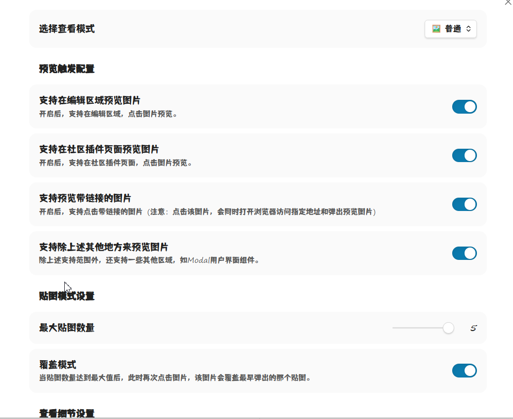 - 关闭(默认):普通模式,一次只看一张图,有背景遮罩。