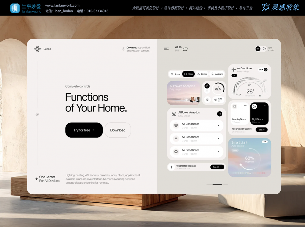 - 如 Lumio 智能家居平台,用米白和浅灰的低饱和色调,营造了温暖、安心的居家情绪价值。