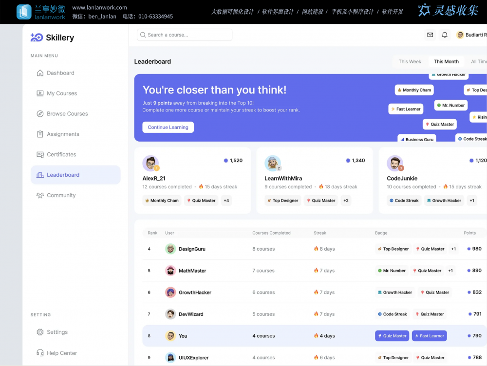 - Skillery 平台的排行榜,通过成就徽章的弹出动画,强化了用户的成就感。
