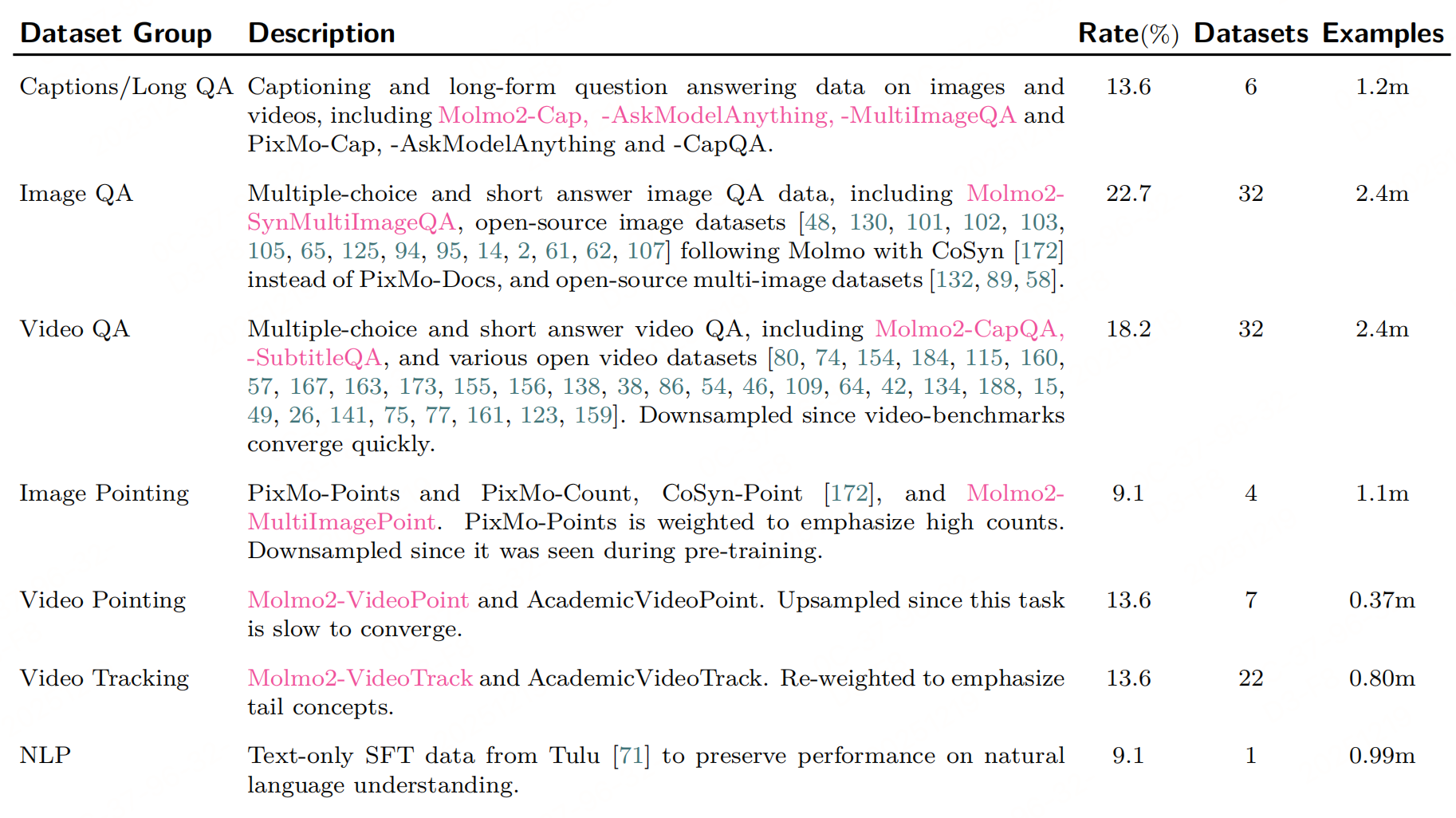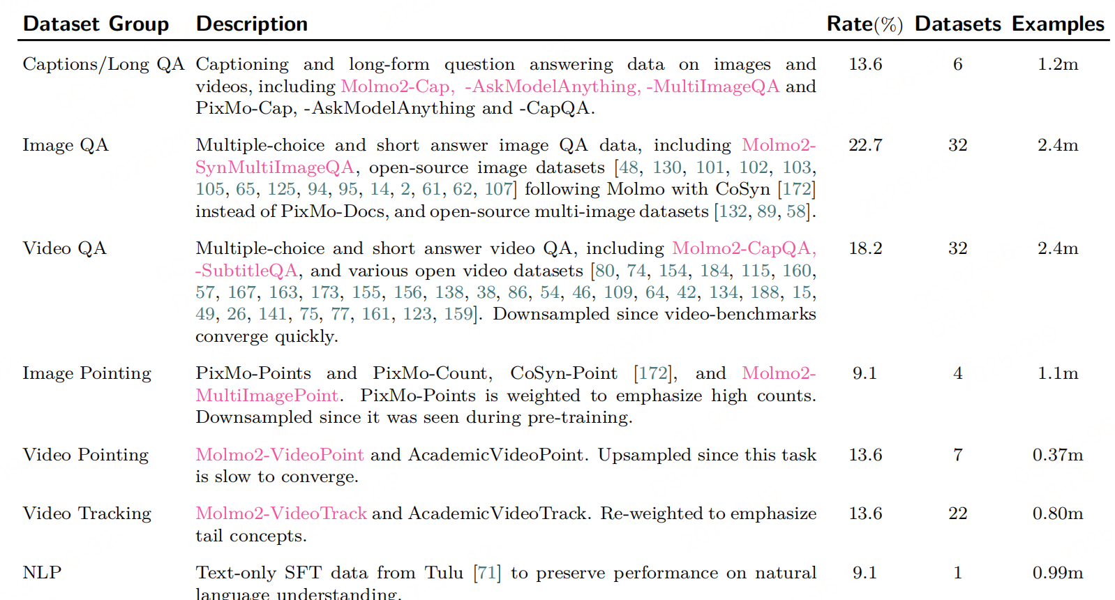 - 图像指向数据:PixMo-Points(图像指向)、PixMo-Count(图像计数)、CoSyn-Point(文本 - rich 图像指向),占比 30%,提前让模型掌握 "像素级定位" 格式与逻辑;