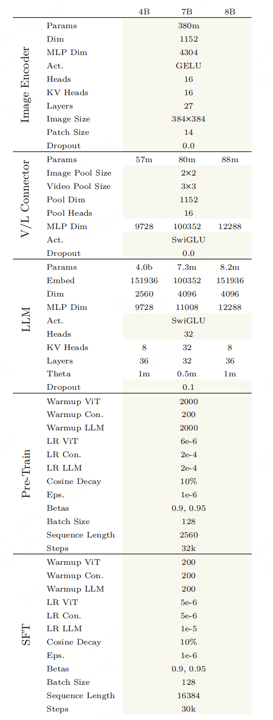 - NLP 数据:Tulu的监督微调数据(过滤非英文与代码),占比 10%,避免视觉训练导致语言能力退化。