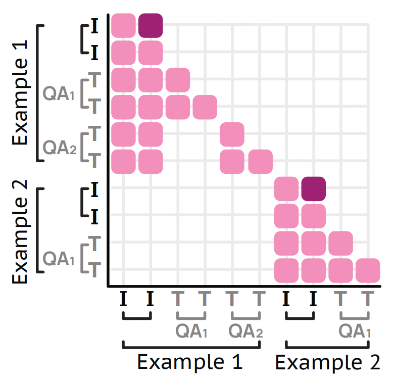 - 跨示例掩码:不同训练示例的视觉 Token/文本之间不允许注意力交互,避免无关信息干扰;