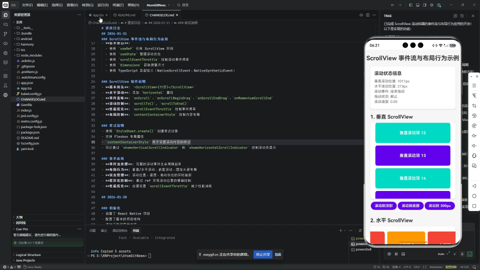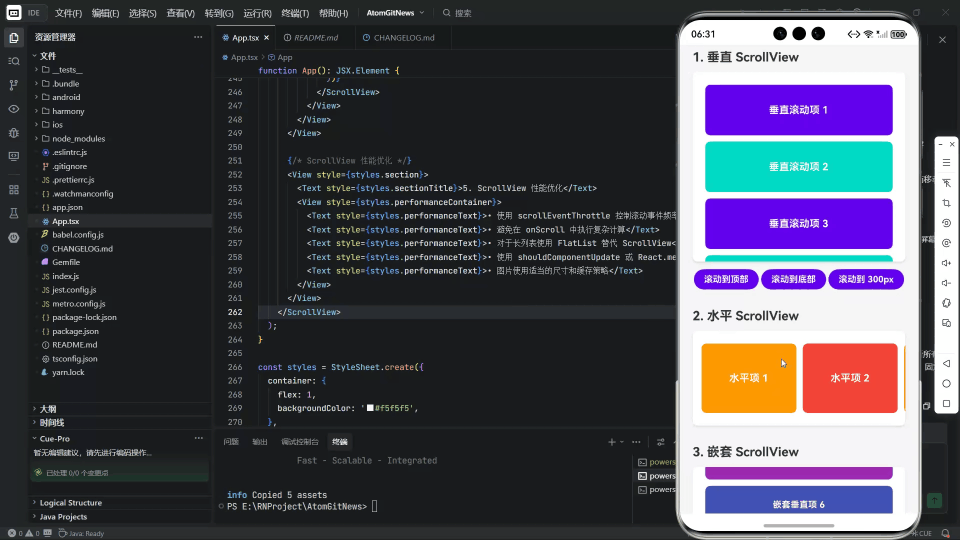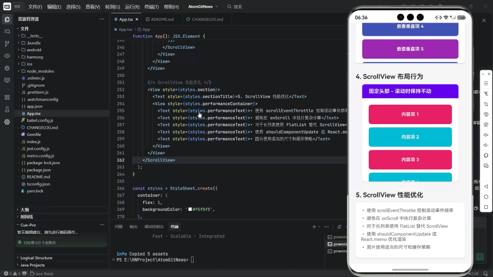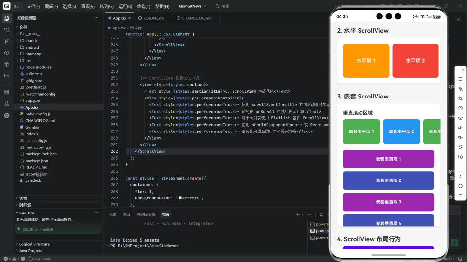 在 React Native for OpenHarmony (RNOH) 的上下文中,ScrollView 的实现面临着双重挑战:既要忠实还原 React Native 的声明式 API 和事件模型,又要高效地桥接到 OpenHarmony 底层的 ArkUI 滚动容器 (如 Scroll 或 List)。2026-01-31 的这次重大更新,通过构建一个全面的 ScrollView 示例应用,精准地切入了这一技术核心。本文将深入解析其代码背后的原理,并探讨在 RNOH 中驾驭 ScrollView 的最佳实践。