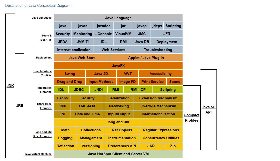 Oracle 在文档中通过 Java 概念图(Java Conceptual Diagram) 把组件按层次组织:上层依赖下层,下层是上层的基础。