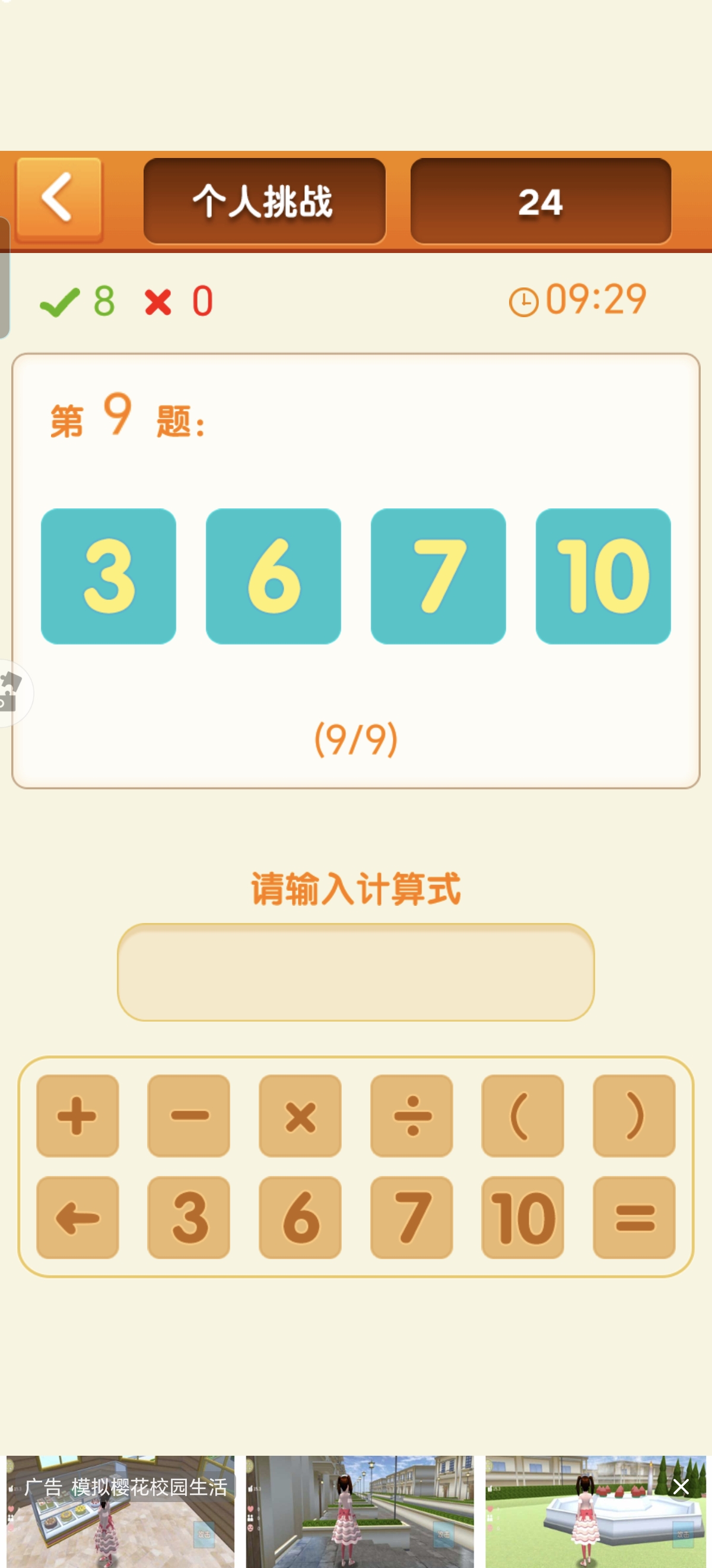 屏幕上输入1〜10范围内的4个整数(可以有重复),对它们进行加、减、乘、除四则运算后(可以任意的加括号限定计算的优先级),寻找计算结果等于24的表达式。\n\n例如输入4个整数4、5、6、7,可得到表达式:4*((5-6)+7)=24。这只是一个解,要求输出全部的解。要求表达式中数字的顺序不能改变。\n\n思路:\n拼凑加减乘除,使4个数的运算结果等于24。\n\n由于四则运算中,乘除的优先级高于加减,所以必须"加括号"来限定4个数之间运算优先级。\n\n例如:A+B*C-D 这个式子,通过增加括号,可以产生多种结果,比如 (A+B)*(C-D) 和 A+(B*C-D)。\n\n那么总共有几种加括号的方法呢,该如何分类呢?\n\n要想将4个数字的运算优先级细分,必须使用两对括号。\n\n可以这么理解:我们的目的是将4个数的运算转换成两个"数"的运算(这里的"数"包括括号表达式),而每两个数运算,就能得出一个结果,即每对括号可以减少一个要计算的数字(如(A+B)*(C+D)中,A和B运算,使式子变成了3个数,C接着和D运算,使式子剩下两个数字)。4-2=2即为需要的括号数。\n\n下面列举所有可能的括号表达式:(#表示四则运算符)\n\n((A#B)#C)#D\n(A#(B#C))#D\nA#((B#C)#D)\nA#(B#(C#D))\n(A#B)#(C#D)\n具体思路:\n\n上面5种括号表达式都可以单独写成函数,函数内部按照括号的优先级+从左往右的顺序进行运算,最后返回计算结果。\n\n每个表达式中有3个'#'号,它们是四则运算符(+、-、*、/),可以定义一个全局字符数组,存放4这四个字符。\n\nchar my_oprator[4] = {'+', '-', '*', '/'};\n