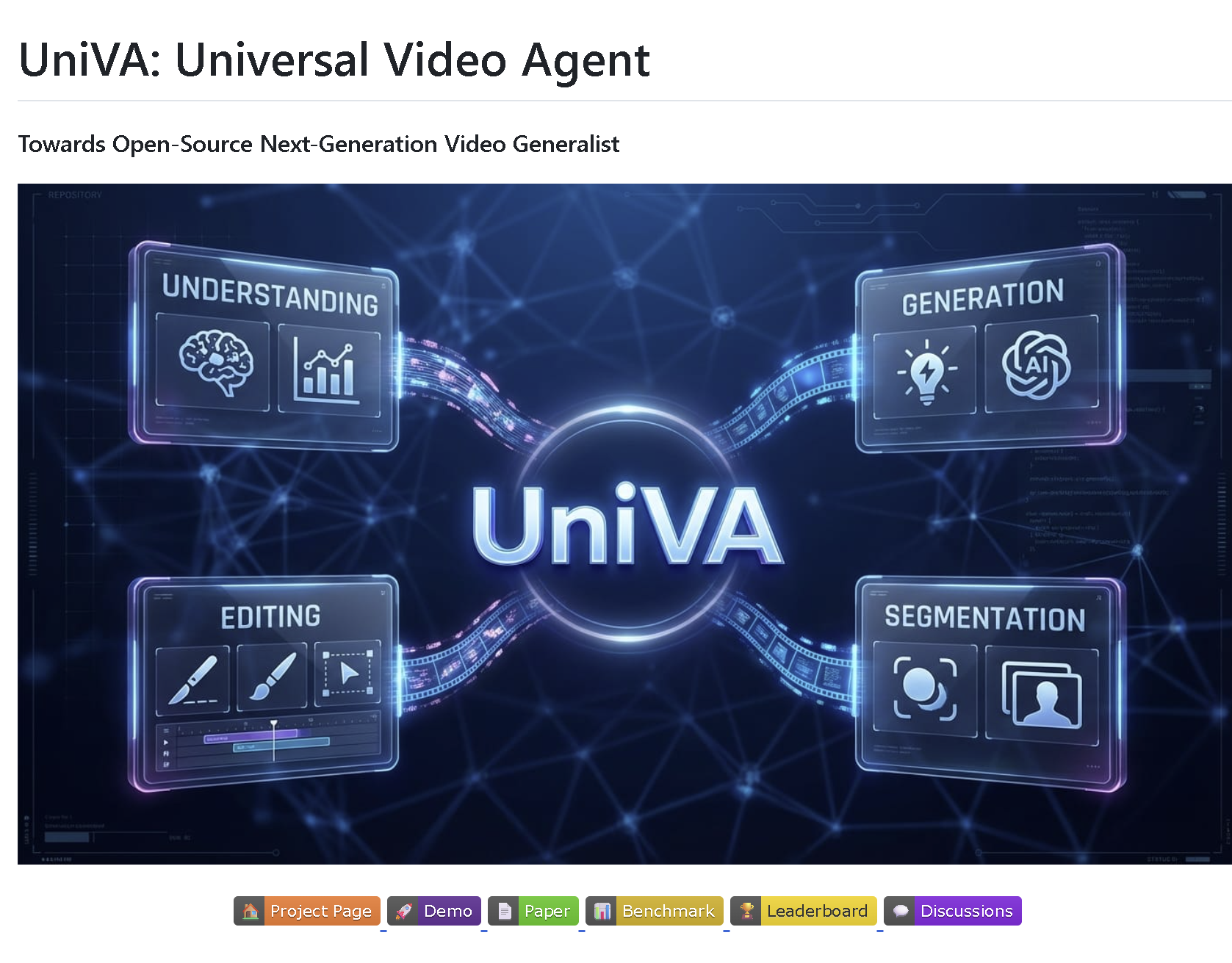 UniVA (Universal Video Agent) is an open-source, next-generation video generalist system that enables you to plan, compose, and produce videos through natural language instructions. UniVA acts as your intelligent video director, iterating shots and stories with you through an agentic, proactive workflow.