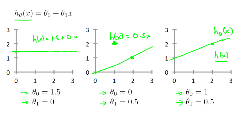参数𝜃_0, 𝜃_1对应函数图像的截距和斜率,不同𝜃_0, 𝜃_1对应着不同的函数图像。