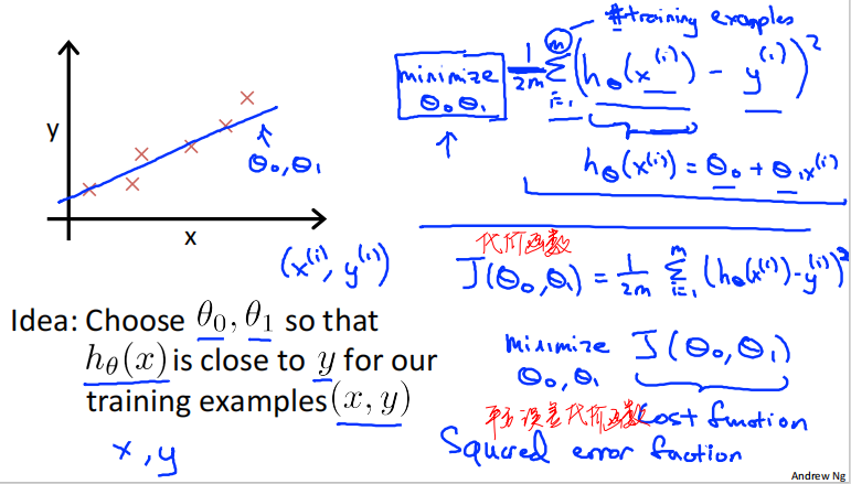 目标为选择出使得建模误差(modeling error)的平方和最小的模型参数,即使得代价函数
