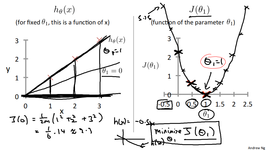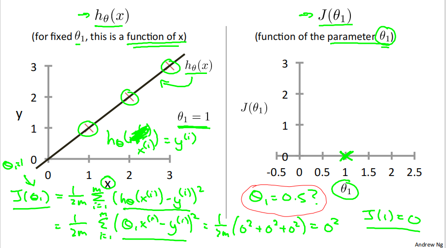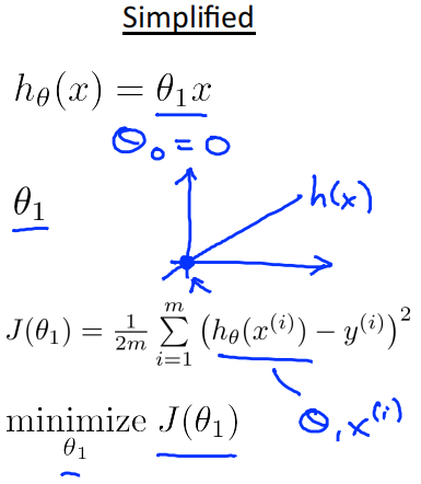 𝐽(𝜃_1) = \\frac{1}{2m} \\sum_{i=1}\^{m}{(ℎ_𝜃(𝑥\^𝑖) − 𝑦\^𝑖)\^2} \\\\=\\frac{1}{2m} \\sum_{i=1}\^{m}{(𝜃_1𝑥\^𝑖 − 𝑦\^𝑖)\^2}